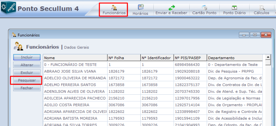 Em “Funcionários”, pesquise pelo nome ou pelo “Nº Folha” (SIAPE) do servidor.