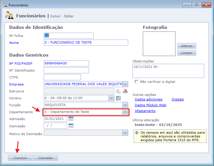 Para alterar a lotação basta entrar no cadastro do servidor (Funcionários) e selecionar o departamento de destino na caixa de seleção Departamento. Após basta clicar em concluir.
