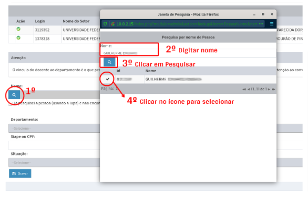 Passo 4 - Na lista que aparecer, clique no ícone para selecionar o docente e a janela será fechada automaticamente.