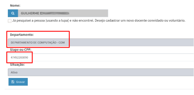 Quando os dados do cadastro básico de pessoa são salvos, a janela é fechada e o e-Campus já traz o nome preenchido, faltando apenas preencher Departamento, Siape/CPF e Situação.