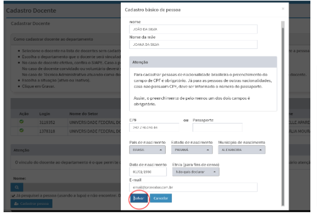 Passo 2 - Na janela “Cadastro básico de pessoa” que sobressair, preencher os campos conforme solicitado e clicar em “Salvar”.