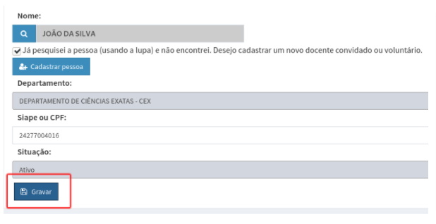 Se o docente não for localizado após pesquisa utilizando a lupa, na própria tela de cadastro de docente há a opção de fazer o cadastro de pessoa.